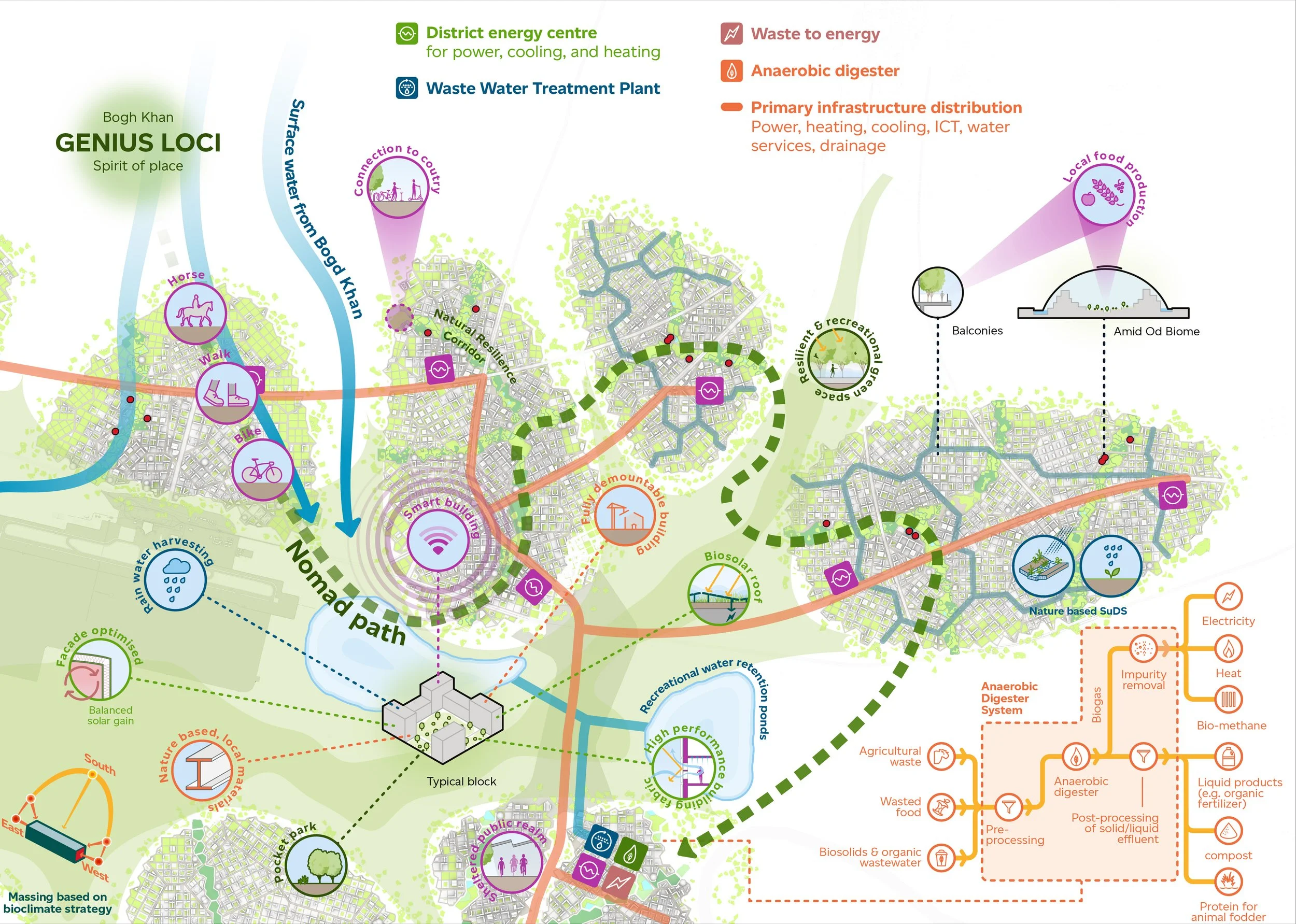 The plan unfolds through adaptive, successive design phases that are learned from earlier phases, mirroring how healthy ecosystems evolve. Natural succession planting establishes the conditions for long-term soil health and ecological service stability, while the water strategy is designed to strengthen, rather than burden, the region’s vulnerable hydrological system. Natural pathways and corridors support both human and wildlife movement, reinforcing a central principle known well to Mongolians: that regenerative design is an ongoing dance with nature.