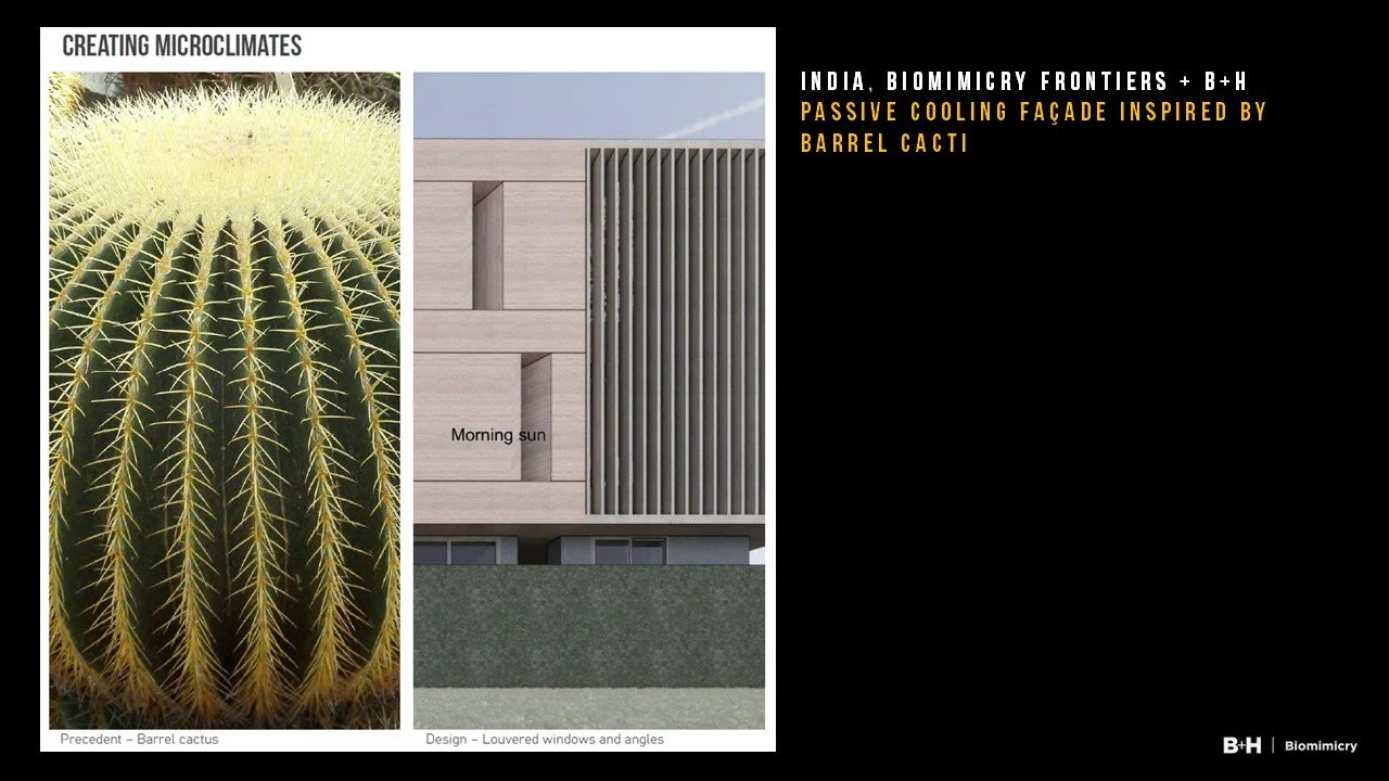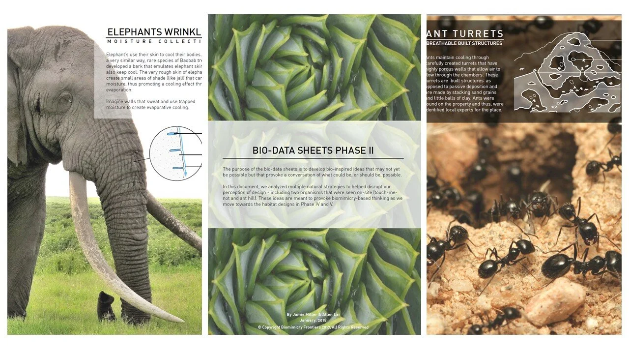 Micro-climates inspired by barrel cactus, passive cooling inspired by cracks in elephant skin, water strategies inspired by baobab tree, and passive ventilation inspired by termite mounds (among others).